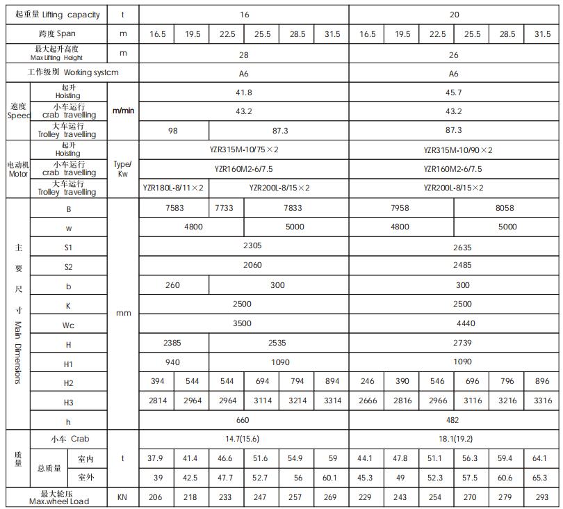 QZ型抓斗起重機(jī)的主要技術(shù)參數(shù)表: